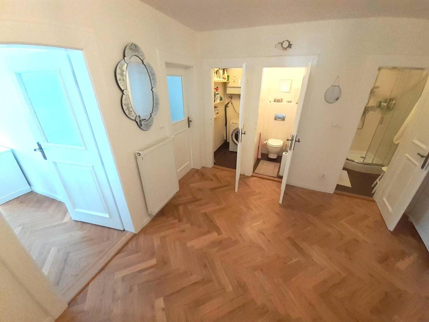 Deluxe Double Room. Featuring free toiletries, this double room includes a shared bathroom with a shower, a hairdryer and slippers. Guests can make meals in the kitchen that features a stovetop, a refrigerator, a dishwasher and kitchenware. The double room has parquet floors, a seating area with a flat-screen TV, a washing machine, a tea and coffee maker as well as city views. The unit has 1 bed. ;